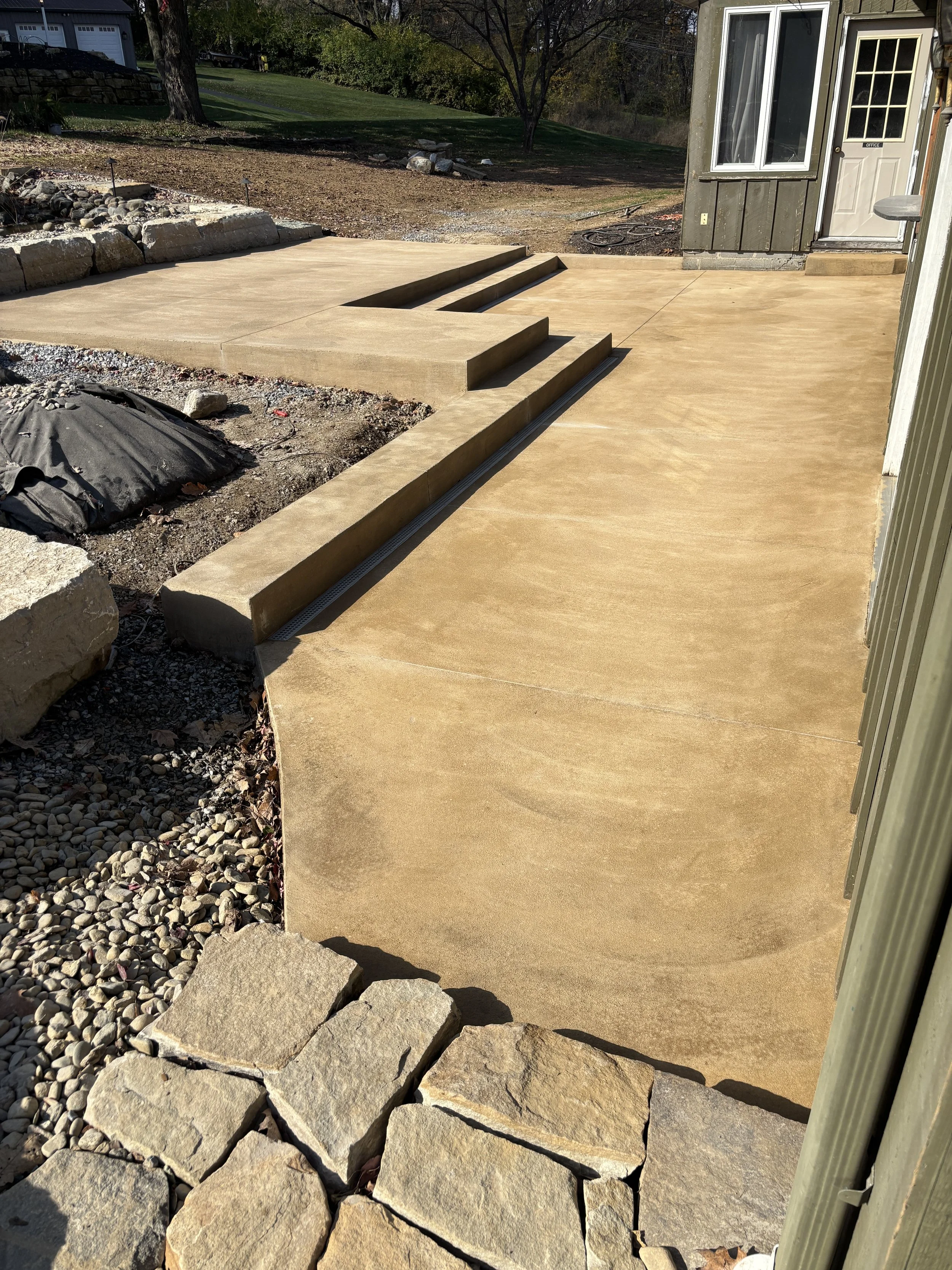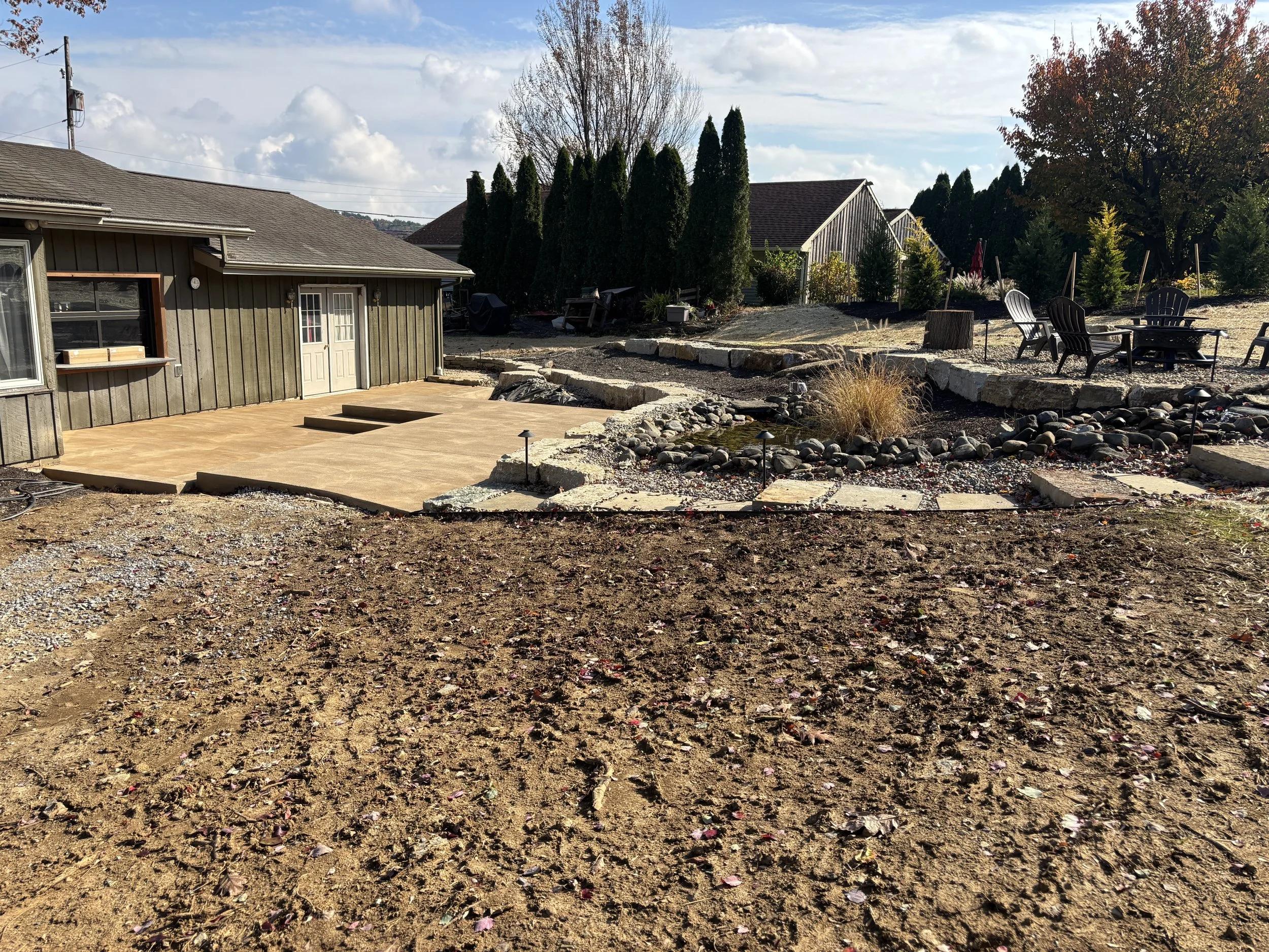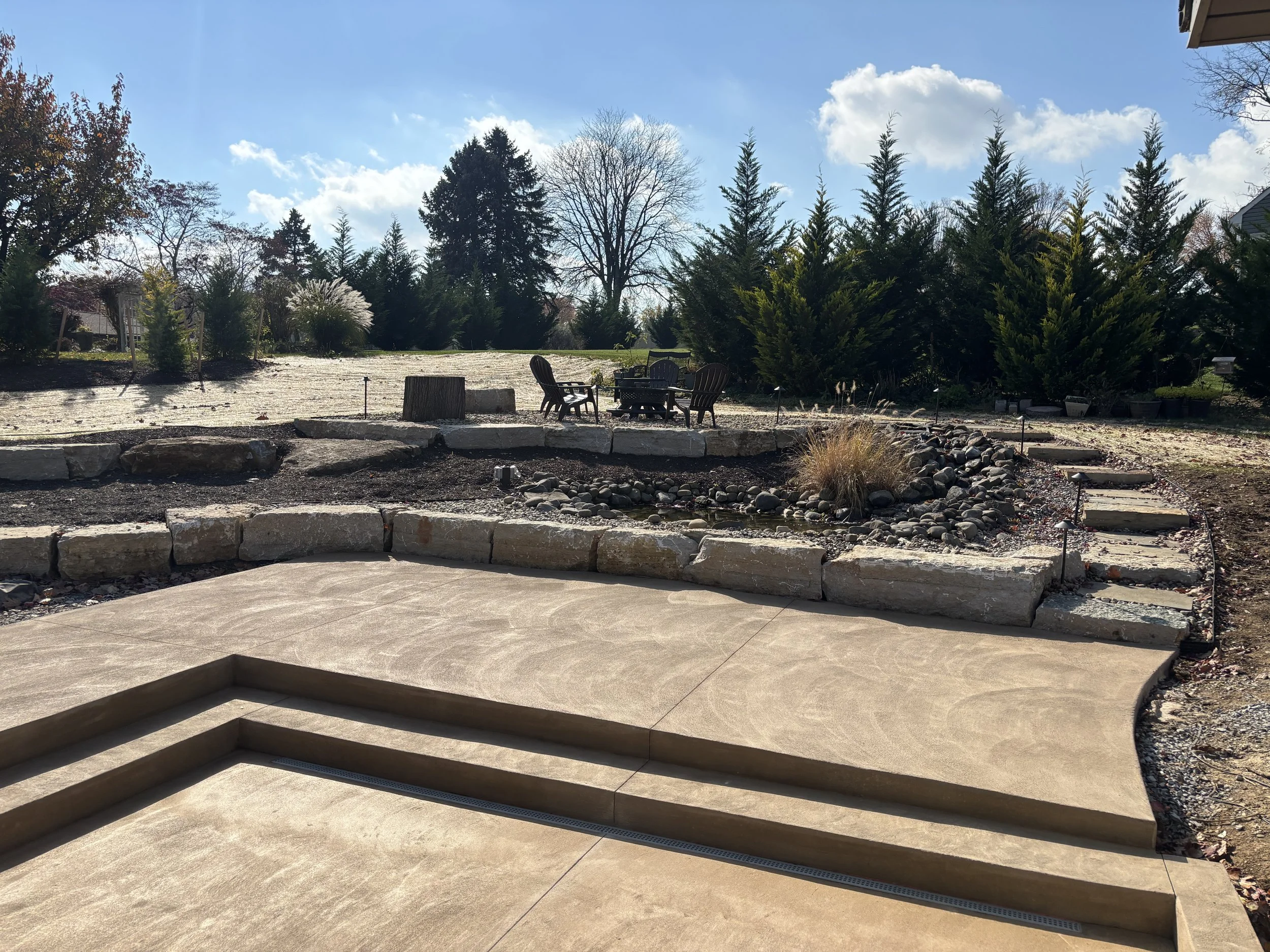 The backyard - Water was running off the neighbors property into her basement. She regraded and landscaped the whole yard, and we added a two tiered patio.